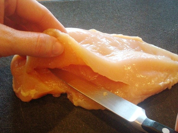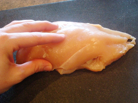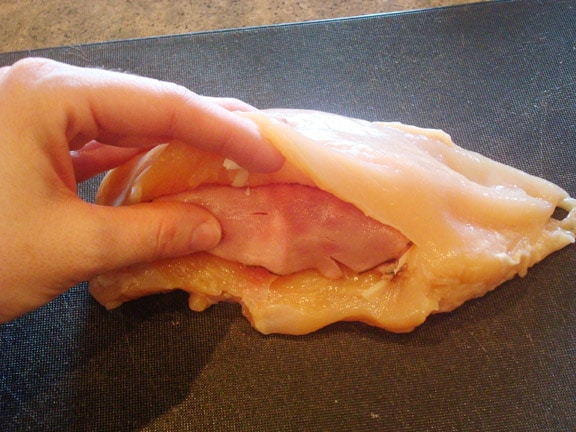 Cut into the thickest part of the chicken breast to make a deep pocket. Be careful not to cut to far over to the edge that needs to stay intact. The opening of the pocket should be three to four inches.