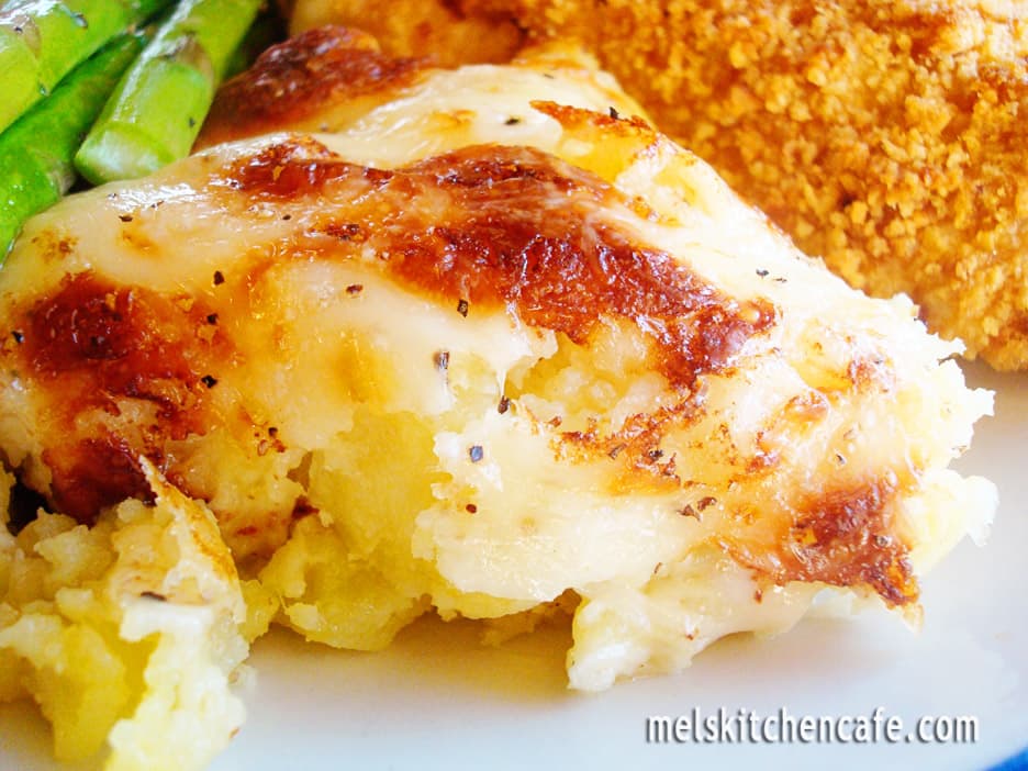 At this point you can either cover the potatoes and refrigerate until baking (I made these the morning before I wanted to serve them). When ready to bake, preheat the oven to 400 degrees and bake the potatoes, uncovered, for 20 minutes, until the potatoes are hot and the top is golden brown. If you are making the potatoes to eat immediately, preheat the broiler and broil the potatoes until the top is golden, 2 to 3 minutes (don’t let them burn!). Let rest for about 5 minutes before serving.